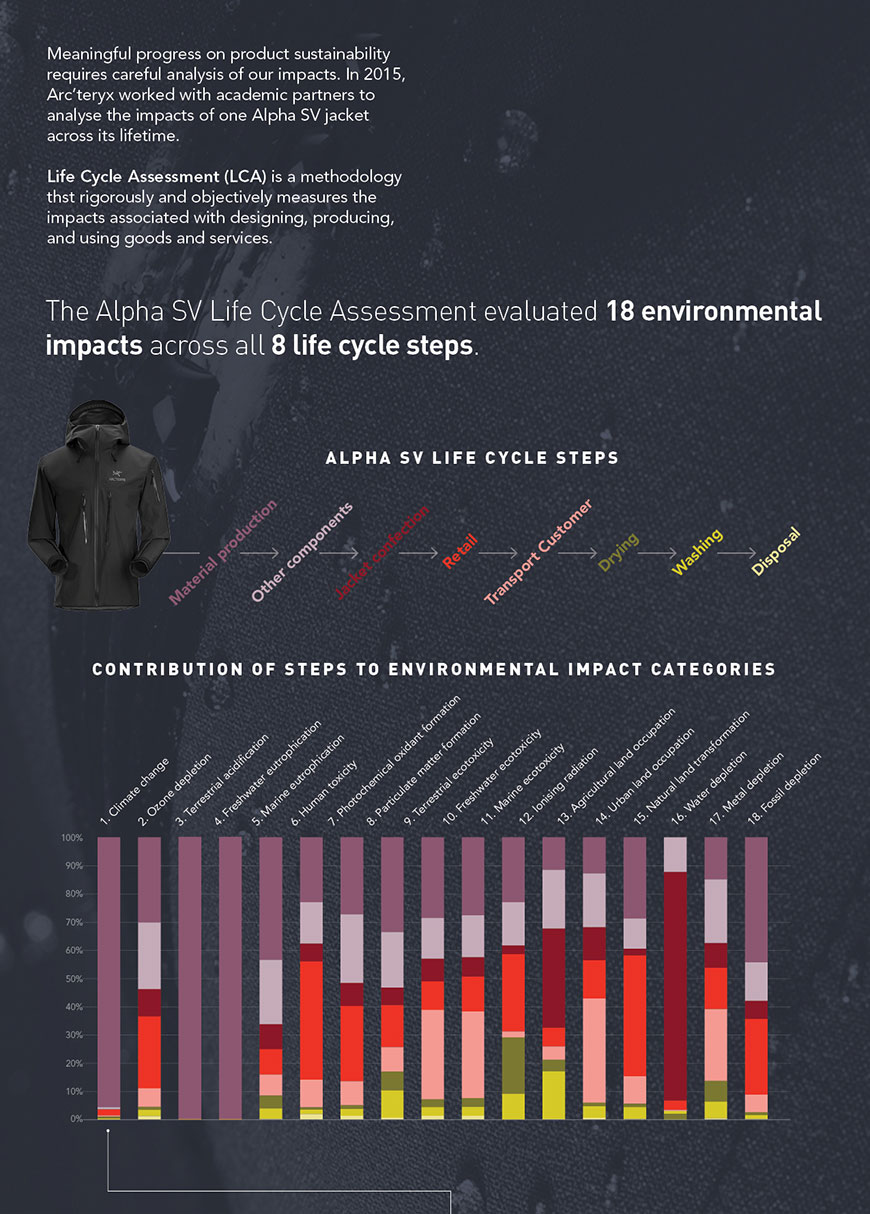 엄격한 검증 과정을 통해 각 단계에서 발생할 수 있는 구체적인 환경 영향을 평가하며 LCA를 통해 아크테릭스의 한 재킷이 끼치는 환경영향의 약 65%가 원자재 생산과 제조에서 비롯되는 된다는 사실을 인지하게 됩니다.